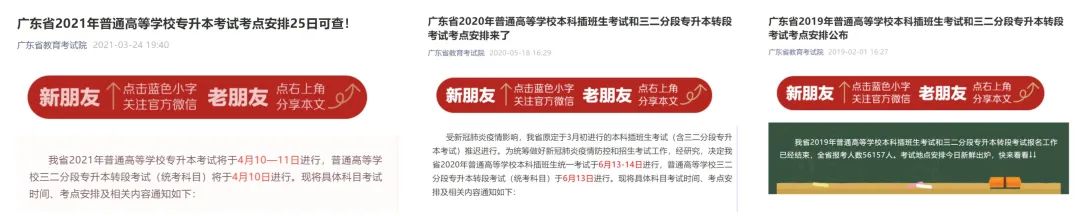 考场信息公布时间 登陆进去之后,点击“考务信息”->“考点查询”,即可看到你被安排到哪个考场了。根据上面的时间: 2021年在考试前两周多公布考场信息(4月10-11日考试) 从表格中可以看出,在2021年考试改革前,官方一般会在考前1个月左右发布全省考场分布。但在改革后,考场只在开通打印准考证的时间公布——通常在考前一周或半个月。 因此小编预测:预计今年2022年的考场在4月13号左右发布! 2. 准考证打印时间 一般在考前7-10天,各位同学可到报考网上打印自己的准考证。 3.考试时间(2022年考试日期改为4月27、28) 4. 上传体检表时间 体检时间:2022年1月1日至填报志愿第一天,请在该时间内体检,超出该时间范围体检无效。 在这个时间段体检完后就马上把体检表上传到报名系统。 5.查询成绩时间 考后一个月就会开放查询系统,大概在四月份考生可查询专插本成绩。公布最低录取分数线。 6.填报志愿时间 大概2022年5月中下旬填志愿,只有超过了最低录取分数线,才有填报志愿的资格。 7.查询录取结果时间 2022年6月初查询录取结果;注意:只报考了校招的同学请留意报考院校的录取情况,同样可在报考网查询录取情况。 8.补录时间 补录也叫征集志愿,预计在2022年6月中下旬补录 2021年的插本补录时间很短只有一天,非常匆忙,今年录取时间段暂时未公布,请以考试院为准。 在第一阶段未被录取或漏报志愿的考生,可参加补录,补录按照第一批-第二批-第三批的投档顺序进行投档,上一个批次结束后才进行下一批次的投档录取。 9.邮寄录取通知书时间 在7月-8月,被录取的学生会陆续收到录取通知书,然后在9月份去学校报到就读。